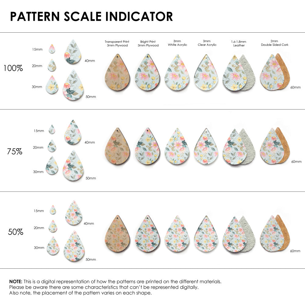 The catalogue image shown is one repeat. If the pattern is seamless, we repeat the pattern to fit to the sheet size, and then scale it so it is suitable for small pieces like earrings.