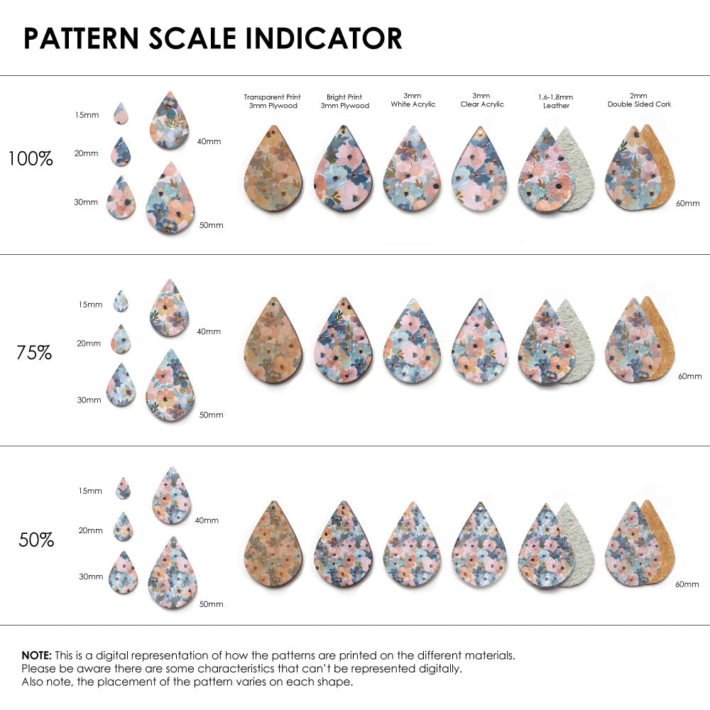 Our patterns can be printed onto Genuine Cowhide Leather, Double Sided Cork, Pine Plywood, White Acrylic or Clear Acrylic or Yupo Paper sheets or earring blanks for making your own earrings. Simply add your own embellishments and findings to make them truly your own.