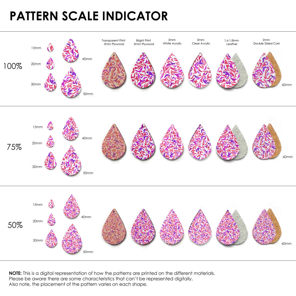 Our patterns can be printed onto Genuine Cowhide Leather, Double Sided Cork, Pine Plywood, White Acrylic or Clear Acrylic or Yupo Paper sheets or earring blanks for making your own earrings. Simply add your own embellishments and findings to make them truly your own.