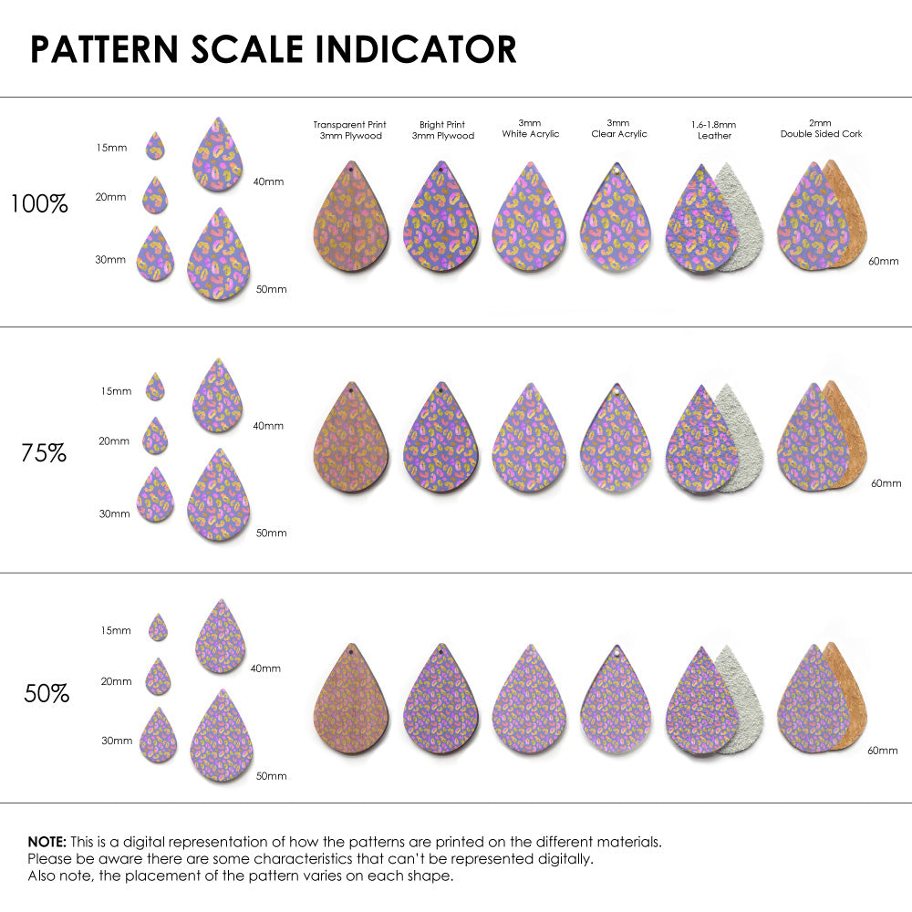 Our patterns can be printed onto Genuine Cowhide Leather, Double Sided Cork, Pine Plywood, White Acrylic or Clear Acrylic or Yupo Paper sheets or earring blanks for making your own earrings. Simply add your own embellishments and findings to make them truly your own.