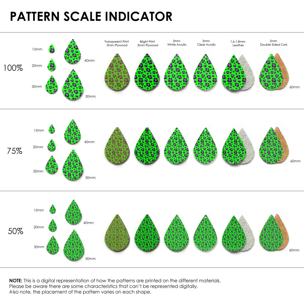 Our patterns can be printed onto Genuine Cowhide Leather, Double Sided Cork, Pine Plywood, White Acrylic or Clear Acrylic or Yupo Paper sheets or earring blanks for making your own earrings. Simply add your own embellishments and findings to make them truly your own.