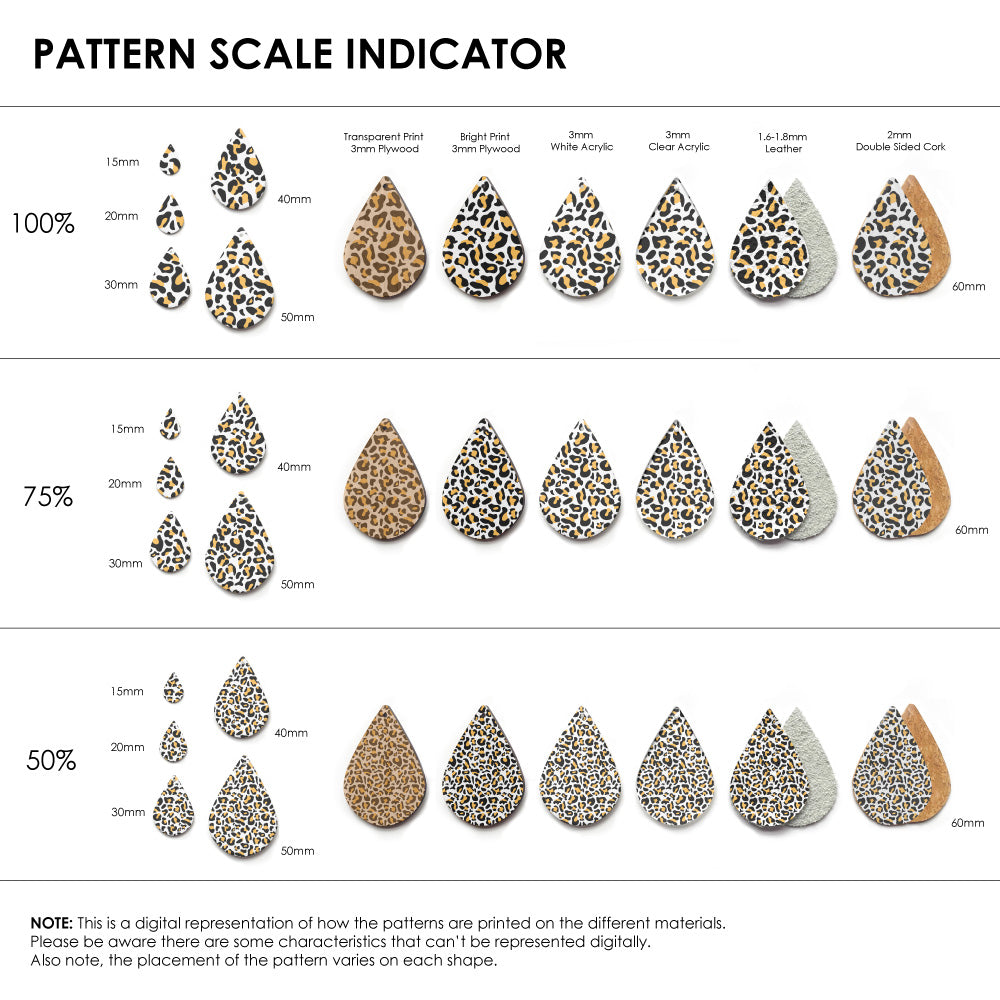 Our patterns can be printed onto Genuine Cowhide Leather, Double Sided Cork, Pine Plywood, White Acrylic or Clear Acrylic or Yupo Paper sheets or earring blanks for making your own earrings. Simply add your own embellishments and findings to make them truly your own.