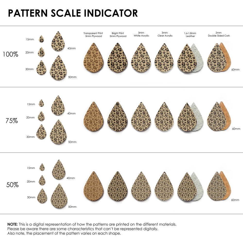 The catalogue image shown is one repeat. If the pattern is seamless, we repeat the pattern to fit to the sheet size, and then scale it so it is suitable for small pieces like earrings.