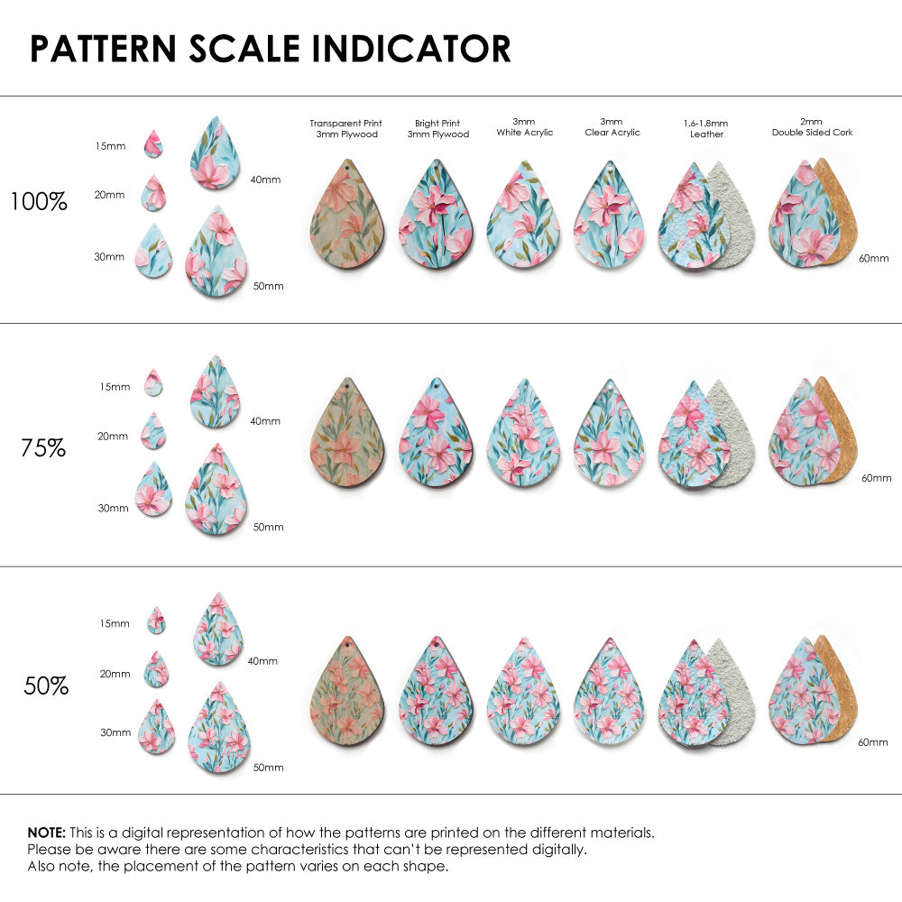Our patterns can be printed onto Genuine Cowhide Leather, Double Sided Cork, Pine Plywood, White Acrylic or Clear Acrylic or Yupo Paper sheets or earring blanks for making your own earrings. Simply add your own embellishments and findings to make them truly your own.