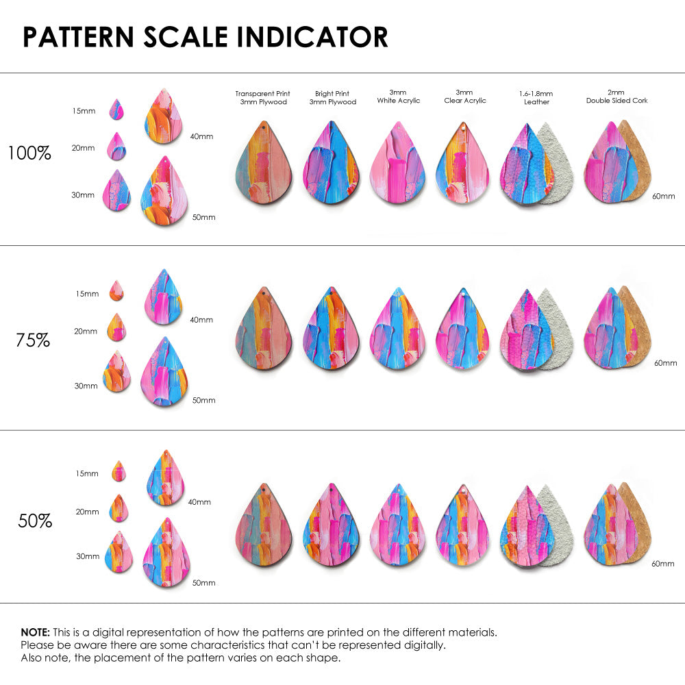 Our patterns can be printed onto Genuine Cowhide Leather, Double Sided Cork, Pine Plywood, White Acrylic or Clear Acrylic or Yupo Paper sheets or earring blanks for making your own earrings. Simply add your own embellishments and findings to make them truly your own.