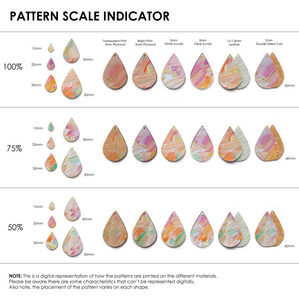 Our patterns can be printed onto Genuine Cowhide Leather, Double Sided Cork, Pine Plywood, White Acrylic or Clear Acrylic or Yupo Paper sheets or earring blanks for making your own earrings. Simply add your own embellishments and findings to make them truly your own.