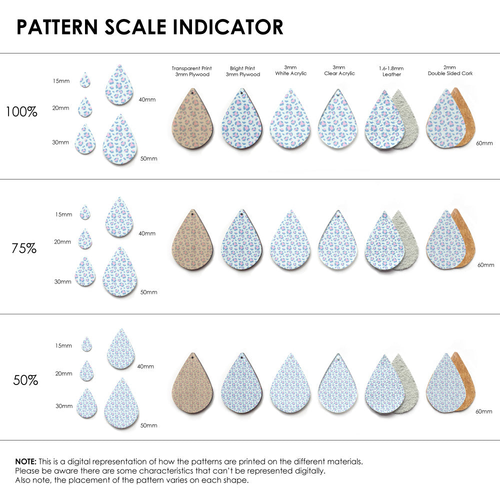 Our patterns can be printed onto Genuine Cowhide Leather, Double Sided Cork, Pine Plywood, White Acrylic or Clear Acrylic or Yupo Paper sheets or earring blanks for making your own earrings. Simply add your own embellishments and findings to make them truly your own.