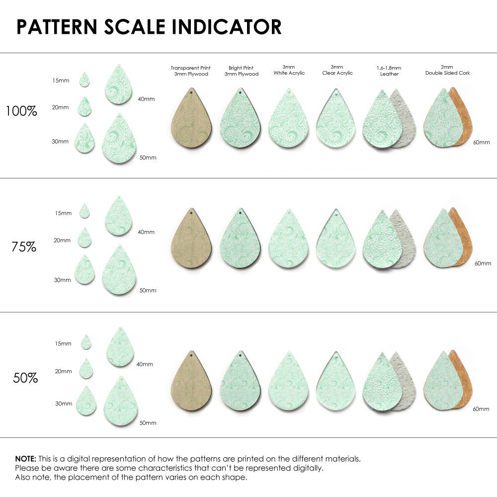 Our patterns can be printed onto Genuine Cowhide Leather, Double Sided Cork, Pine Plywood, White Acrylic or Clear Acrylic or Yupo Paper sheets or earring blanks for making your own earrings. Simply add your own embellishments and findings to make them truly your own.