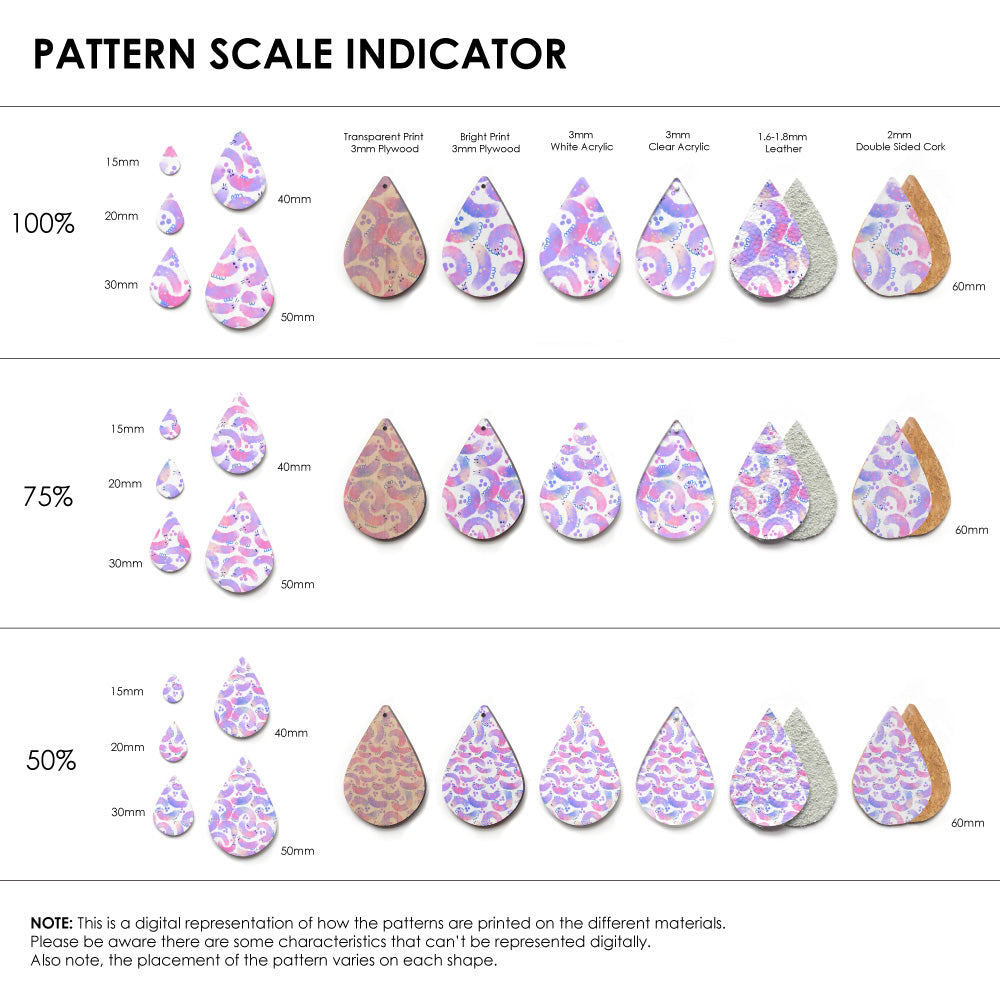 Our patterns can be printed onto Genuine Cowhide Leather, Double Sided Cork, Pine Plywood, White Acrylic or Clear Acrylic or Yupo Paper sheets or earring blanks for making your own earrings. Simply add your own embellishments and findings to make them truly your own.