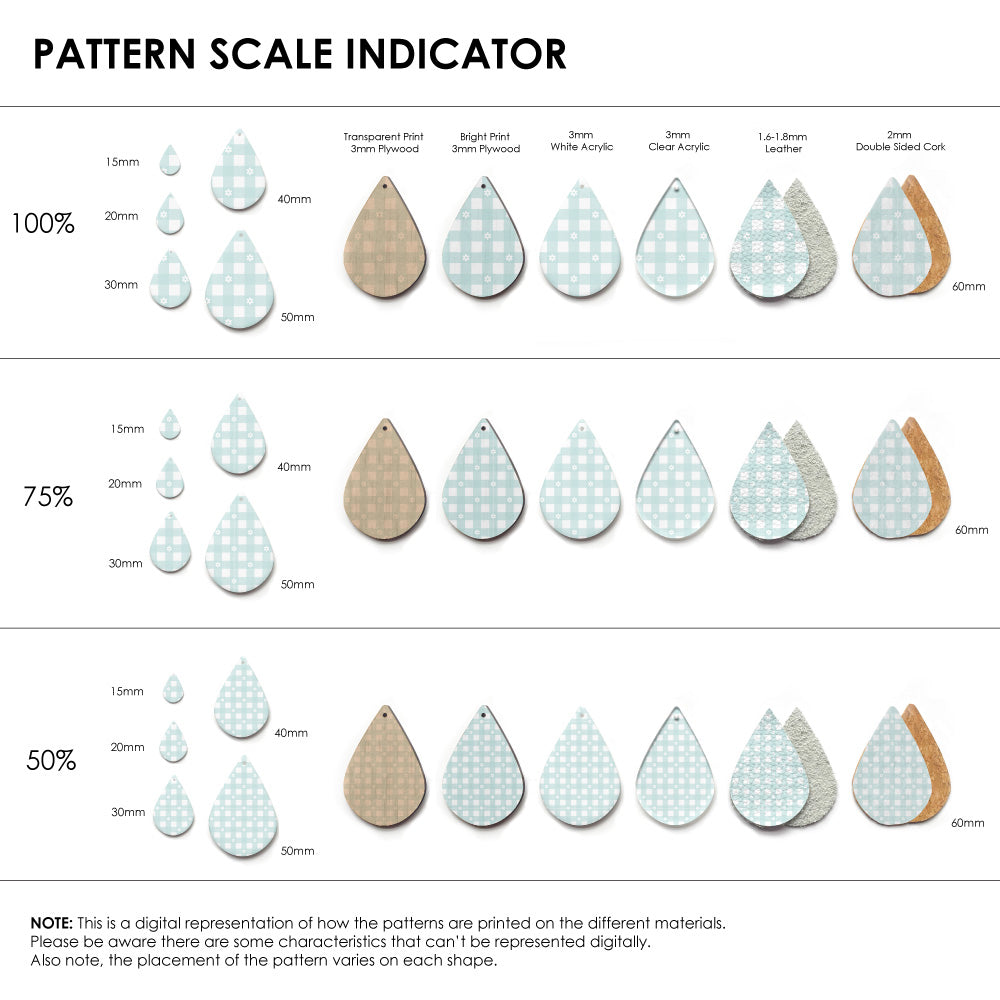 The catalogue image shown is one repeat. If the pattern is seamless, we repeat the pattern to fit to the sheet size, and then scale it so it is suitable for small pieces like earrings.