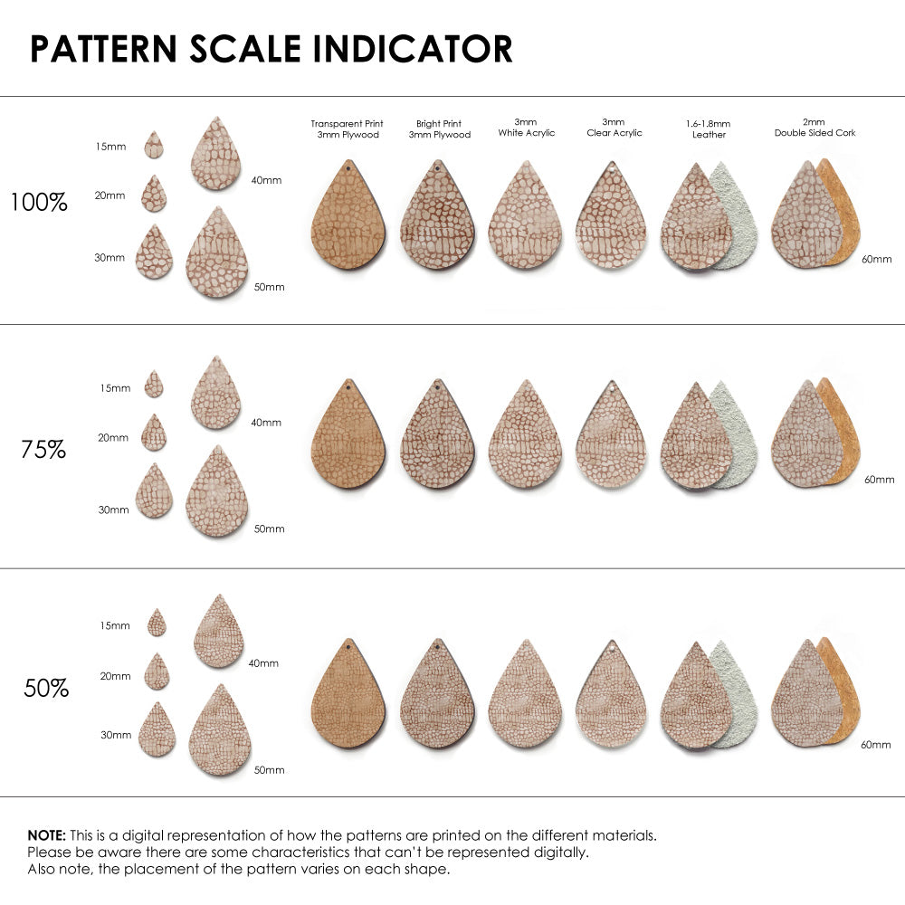 The catalogue image shown is one repeat. If the pattern is seamless, we repeat the pattern to fit to the sheet size, and then scale it so it is suitable for small pieces like earrings.