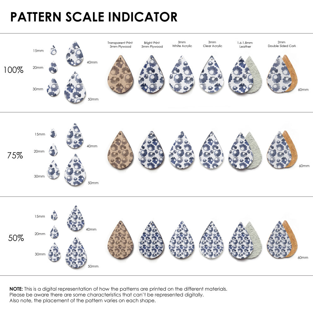 The catalogue image shown is one repeat. If the pattern is seamless, we repeat the pattern to fit to the sheet size, and then scale it so it is suitable for small pieces like earrings.