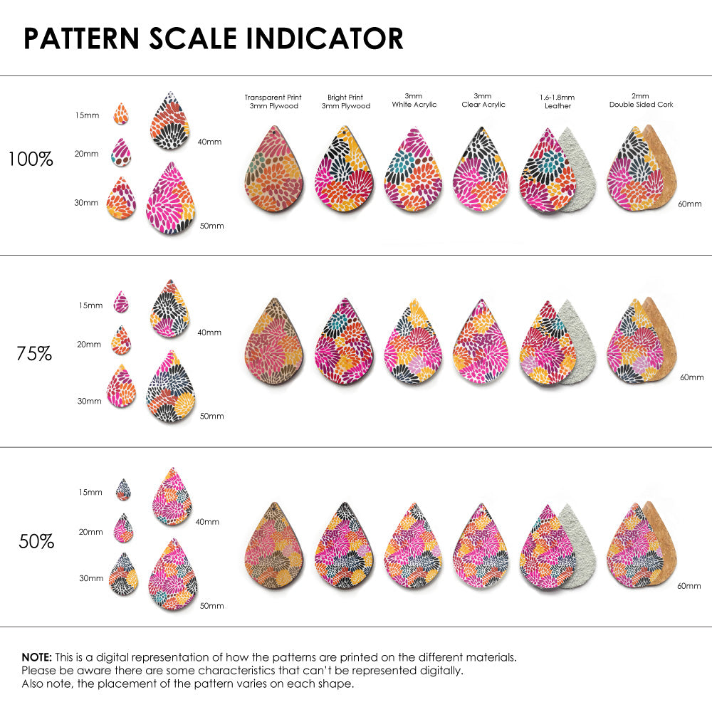 Our patterns can be printed onto Genuine Cowhide Leather, Double Sided Cork, Pine Plywood, White Acrylic or Clear Acrylic or Yupo Paper sheets or earring blanks for making your own earrings. Simply add your own embellishments and findings to make them truly your own.