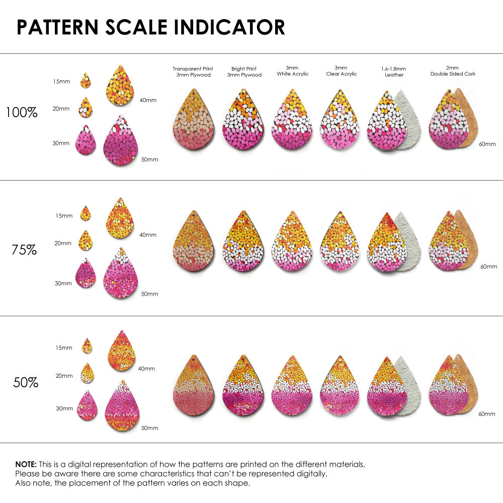 Our patterns can be printed onto Genuine Cowhide Leather, Double Sided Cork, Pine Plywood, White Acrylic or Clear Acrylic or Yupo Paper sheets or earring blanks for making your own earrings. Simply add your own embellishments and findings to make them truly your own.
