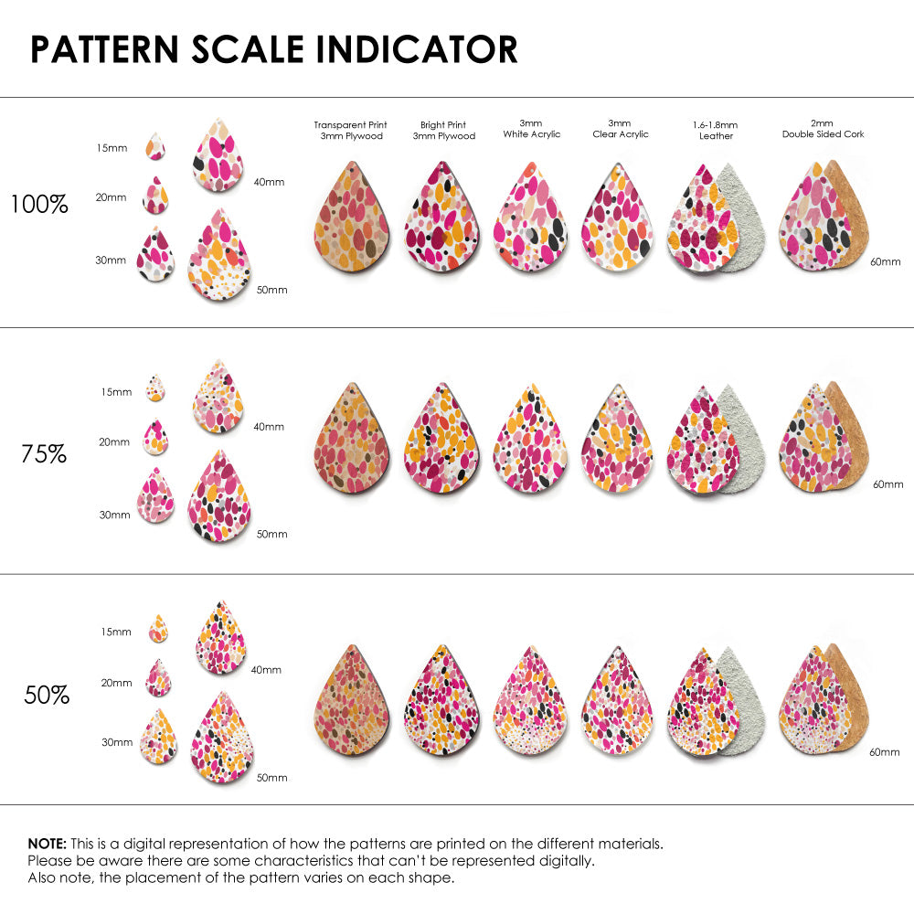 Our patterns can be printed onto Genuine Cowhide Leather, Double Sided Cork, Pine Plywood, White Acrylic or Clear Acrylic or Yupo Paper sheets or earring blanks for making your own earrings. Simply add your own embellishments and findings to make them truly your own.