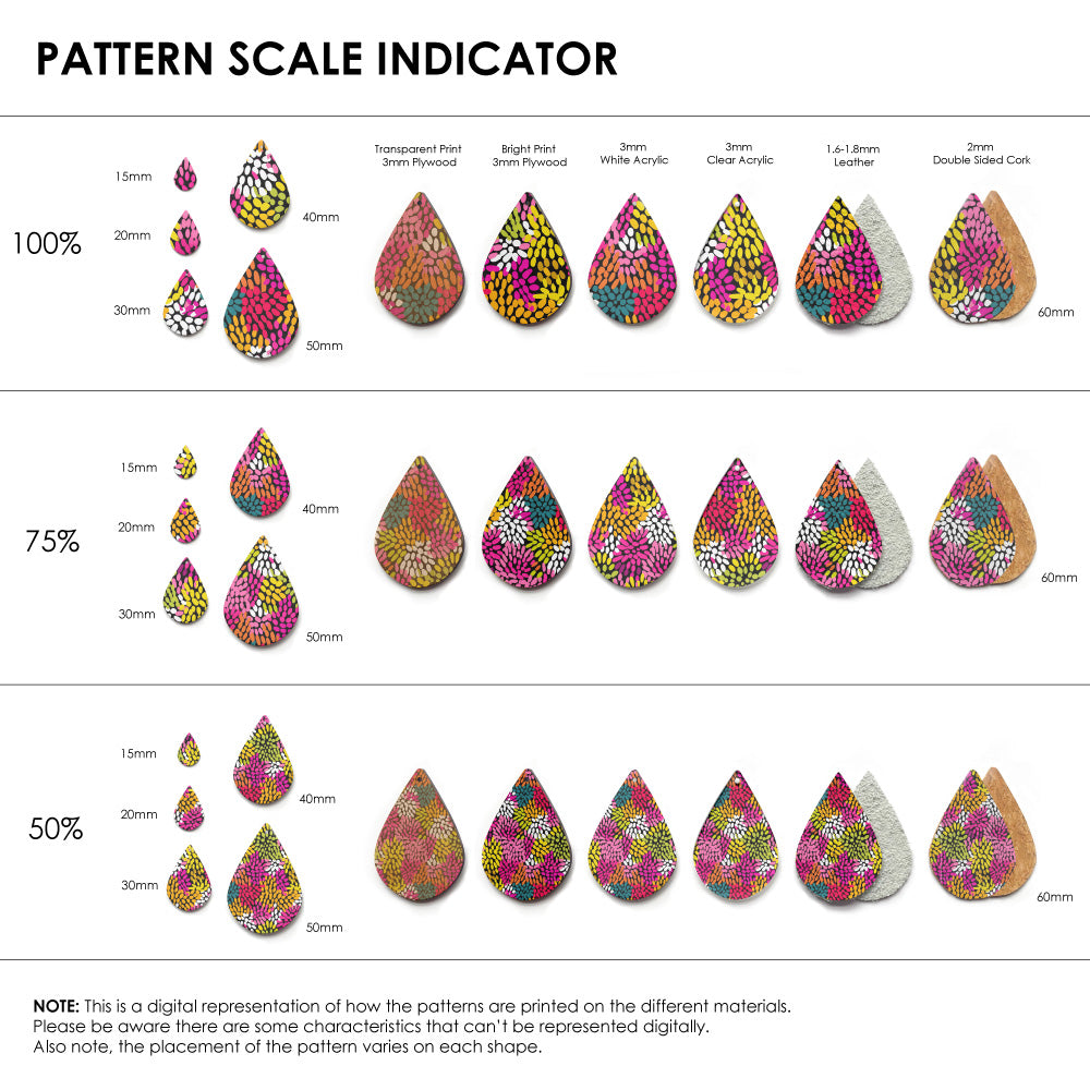 Our patterns can be printed onto Genuine Cowhide Leather, Double Sided Cork, Pine Plywood, White Acrylic or Clear Acrylic or Yupo Paper sheets or earring blanks for making your own earrings. Simply add your own embellishments and findings to make them truly your own.
