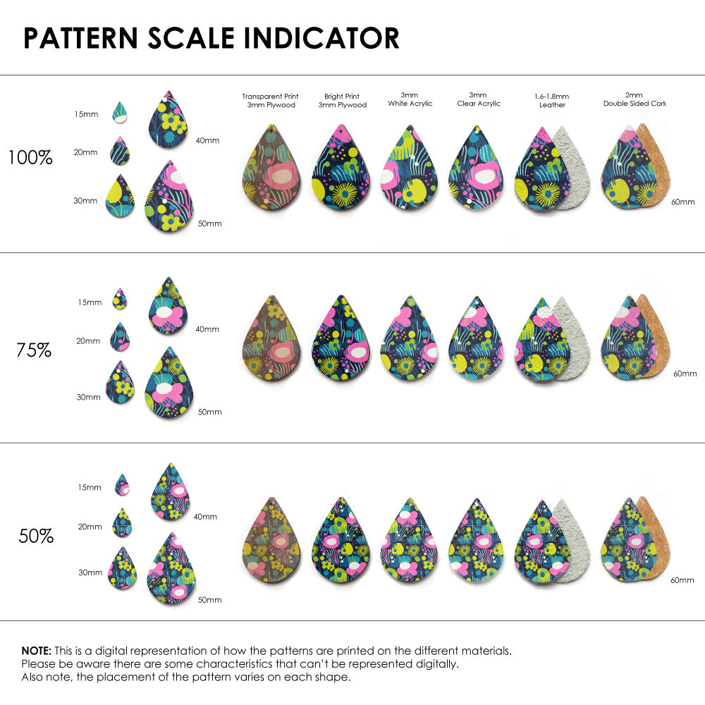 Our patterns can be printed onto Genuine Cowhide Leather, Double Sided Cork, Pine Plywood, White Acrylic or Clear Acrylic or Yupo Paper sheets or earring blanks for making your own earrings. Simply add your own embellishments and findings to make them truly your own.