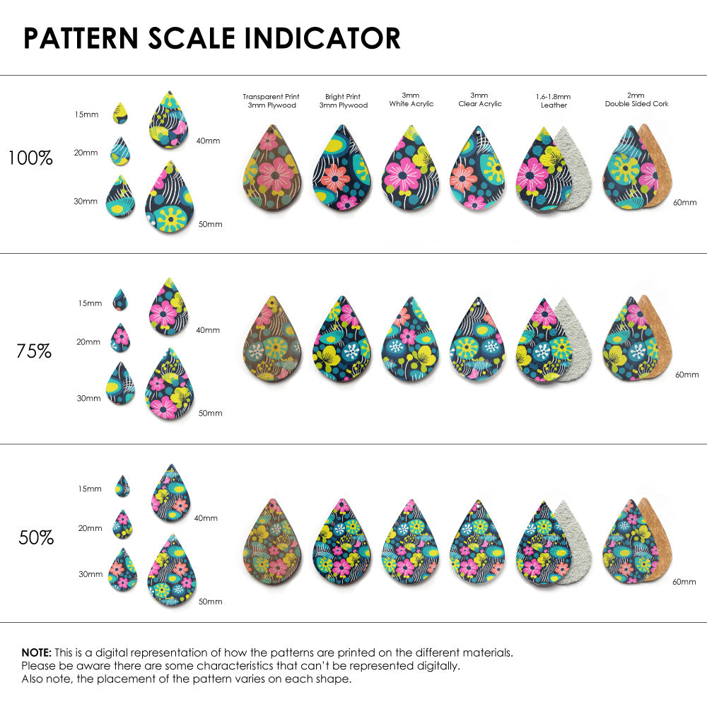 Our patterns can be printed onto Genuine Cowhide Leather, Double Sided Cork, Pine Plywood, White Acrylic or Clear Acrylic or Yupo Paper sheets or earring blanks for making your own earrings. Simply add your own embellishments and findings to make them truly your own.