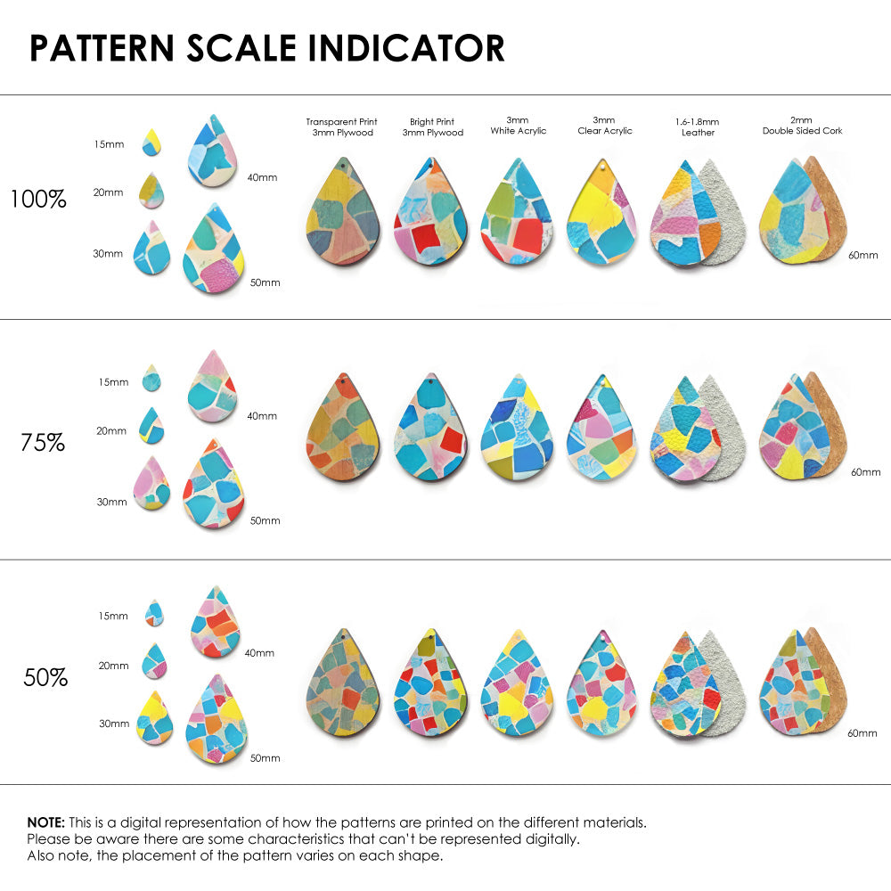Our patterns can be printed onto Genuine Cowhide Leather, Double Sided Cork, Pine Plywood, White Acrylic or Clear Acrylic or Yupo Paper sheets or earring blanks for making your own earrings. Simply add your own embellishments and findings to make them truly your own.