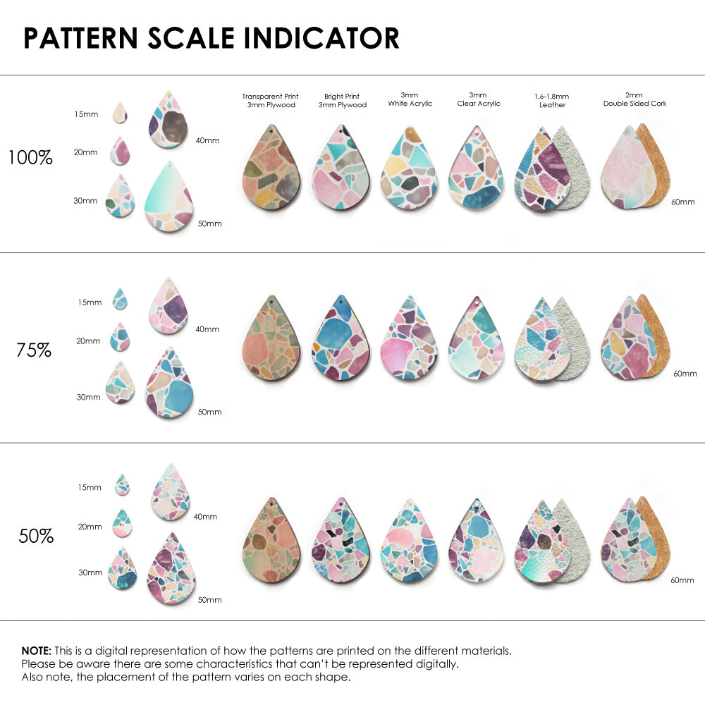 Our patterns can be printed onto Genuine Cowhide Leather, Double Sided Cork, Pine Plywood, White Acrylic or Clear Acrylic or Yupo Paper sheets or earring blanks for making your own earrings. Simply add your own embellishments and findings to make them truly your own.