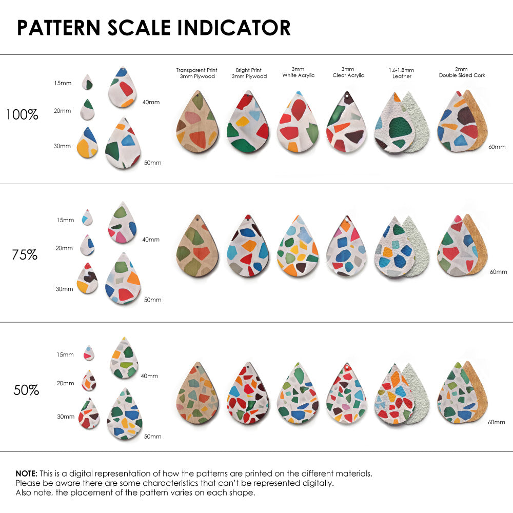 Our patterns can be printed onto Genuine Cowhide Leather, Double Sided Cork, Pine Plywood, White Acrylic or Clear Acrylic or Yupo Paper sheets or earring blanks for making your own earrings. Simply add your own embellishments and findings to make them truly your own.