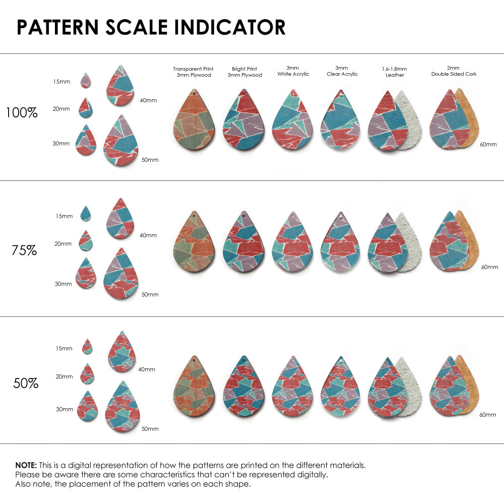 Our patterns can be printed onto Genuine Cowhide Leather, Double Sided Cork, Pine Plywood, White Acrylic or Clear Acrylic or Yupo Paper sheets or earring blanks for making your own earrings. Simply add your own embellishments and findings to make them truly your own.