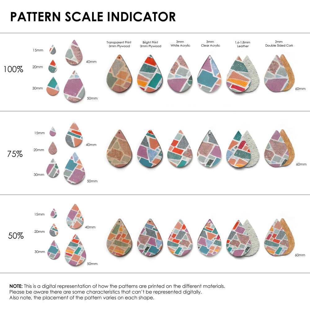 The catalogue image shown is one repeat. If the pattern is seamless, we repeat the pattern to fit to the sheet size, and then scale it so it is suitable for small pieces like earrings.