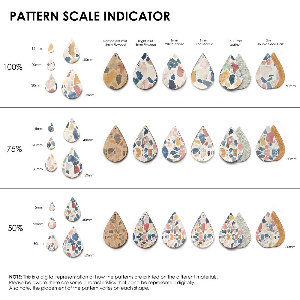 The catalogue image shown is one repeat. If the pattern is seamless, we repeat the pattern to fit to the sheet size, and then scale it so it is suitable for small pieces like earrings.