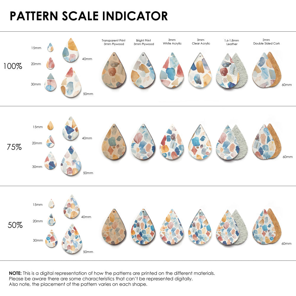 Our patterns can be printed onto Genuine Cowhide Leather, Double Sided Cork, Pine Plywood, White Acrylic or Clear Acrylic or Yupo Paper sheets or earring blanks for making your own earrings. Simply add your own embellishments and findings to make them truly your own.