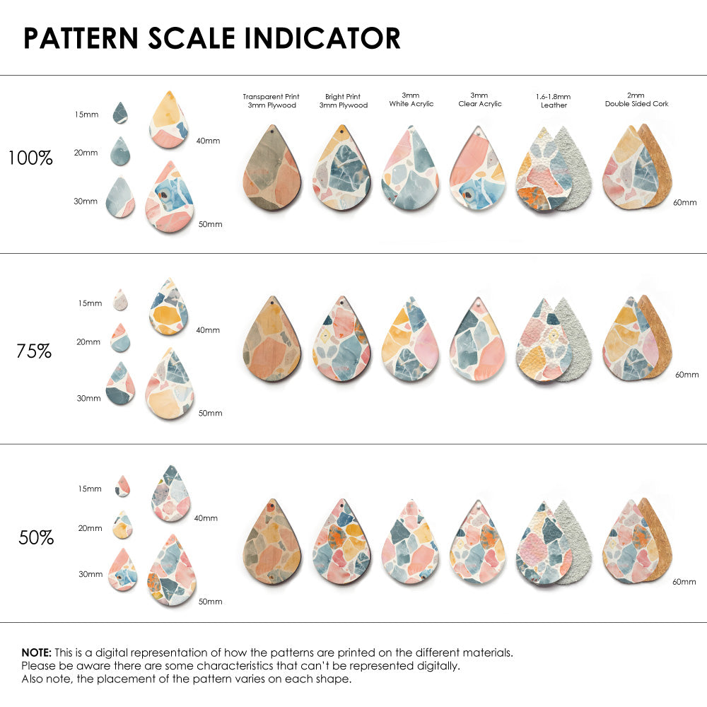 Our patterns can be printed onto Genuine Cowhide Leather, Double Sided Cork, Pine Plywood, White Acrylic or Clear Acrylic or Yupo Paper sheets or earring blanks for making your own earrings. Simply add your own embellishments and findings to make them truly your own.