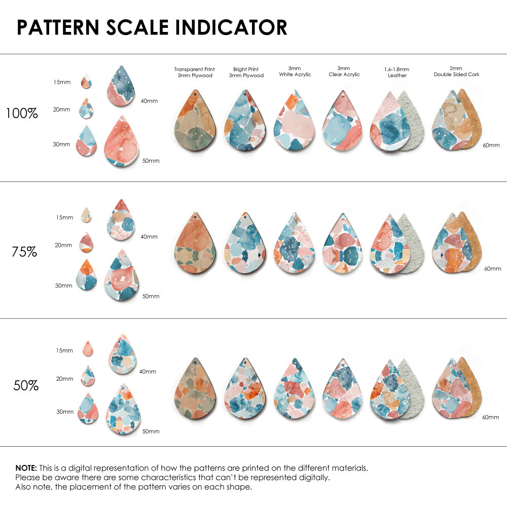 Our patterns can be printed onto Genuine Cowhide Leather, Double Sided Cork, Pine Plywood, White Acrylic or Clear Acrylic or Yupo Paper sheets or earring blanks for making your own earrings. Simply add your own embellishments and findings to make them truly your own.