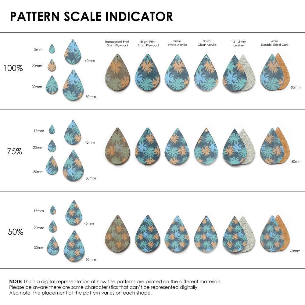 The catalogue image shown is one repeat. If the pattern is seamless, we repeat the pattern to fit to the sheet size, and then scale it so it is suitable for small pieces like earrings.