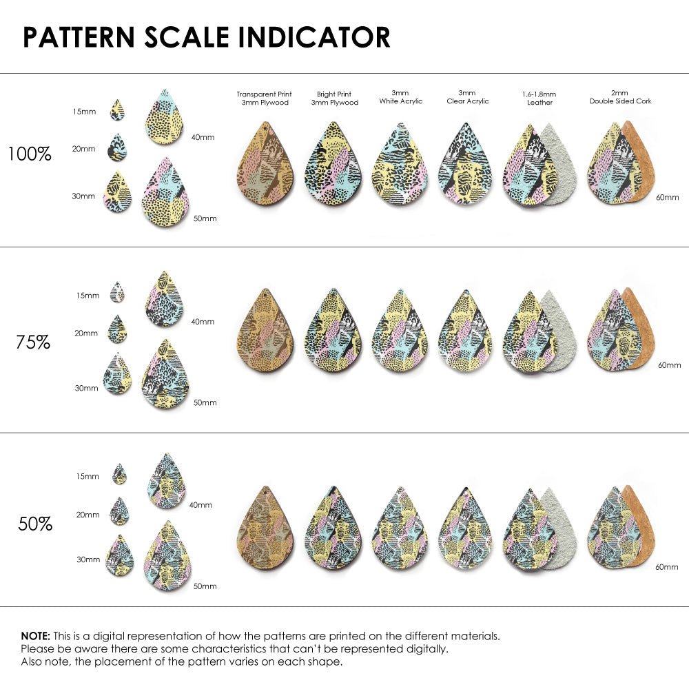 The catalogue image shown is one repeat. If the pattern is seamless, we repeat the pattern to fit to the sheet size, and then scale it so it is suitable for small pieces like earrings.