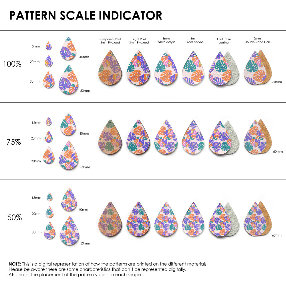 Our patterns can be printed onto Genuine Cowhide Leather, Double Sided Cork, Pine Plywood, White Acrylic or Clear Acrylic or Yupo Paper sheets or earring blanks for making your own earrings. Simply add your own embellishments and findings to make them truly your own.