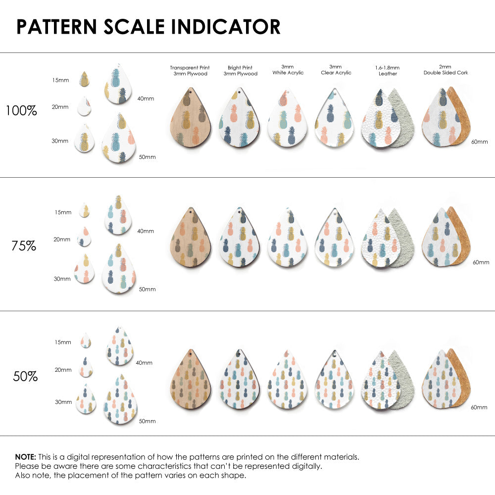 The catalogue image shown is one repeat. If the pattern is seamless, we repeat the pattern to fit to the sheet size, and then scale it so it is suitable for small pieces like earrings.