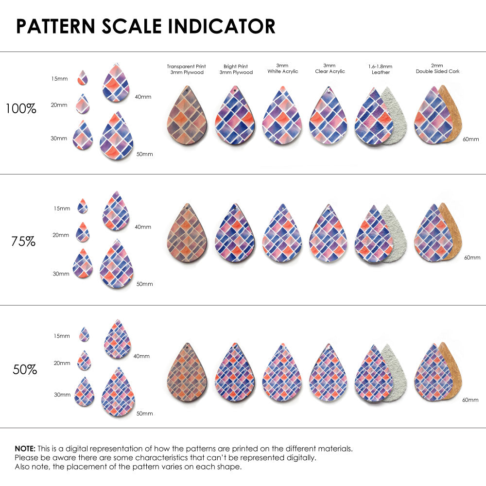 The catalogue image shown is one repeat. If the pattern is seamless, we repeat the pattern to fit to the sheet size, and then scale it so it is suitable for small pieces like earrings.