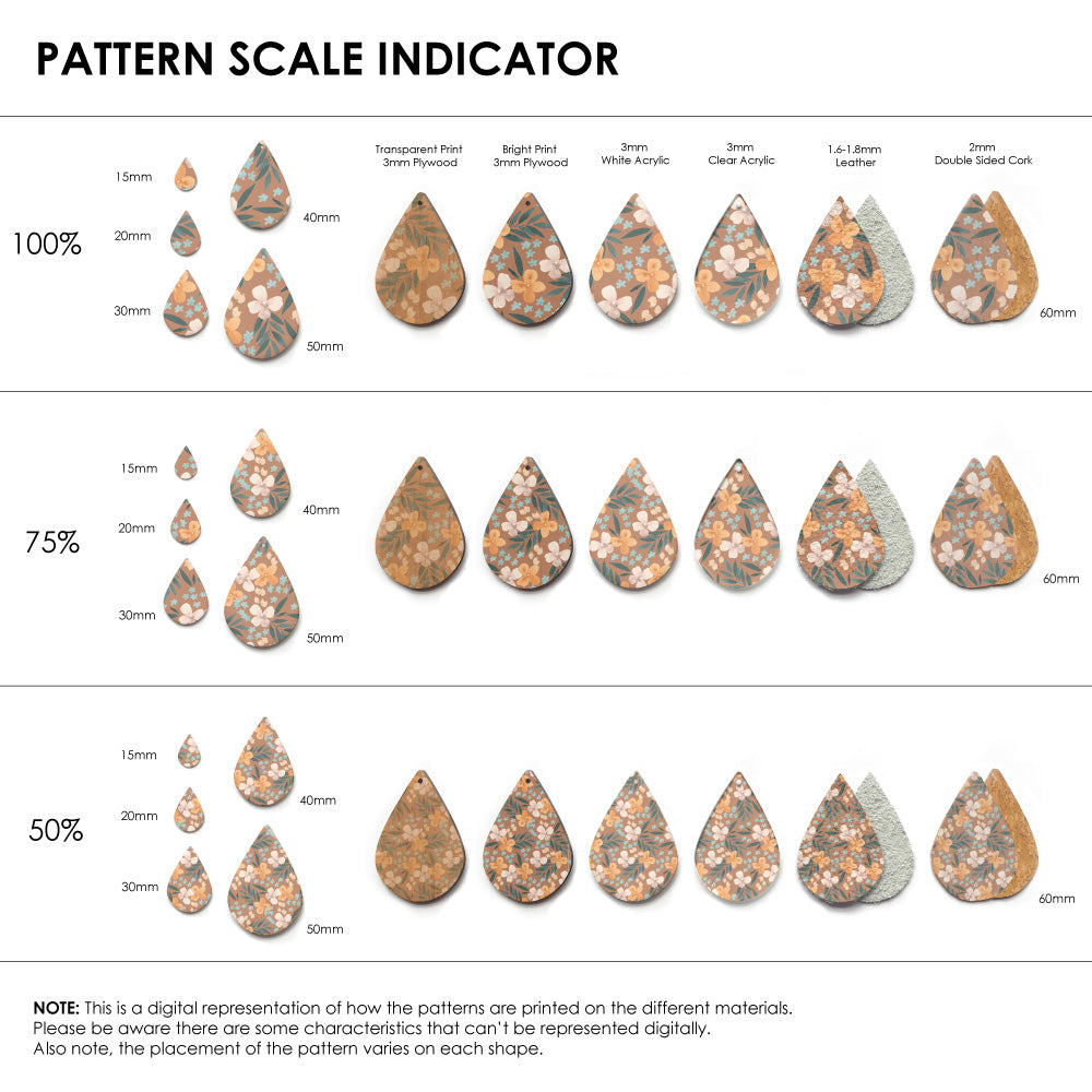The catalogue image shown is one repeat. If the pattern is seamless, we repeat the pattern to fit to the sheet size, and then scale it so it is suitable for small pieces like earrings.