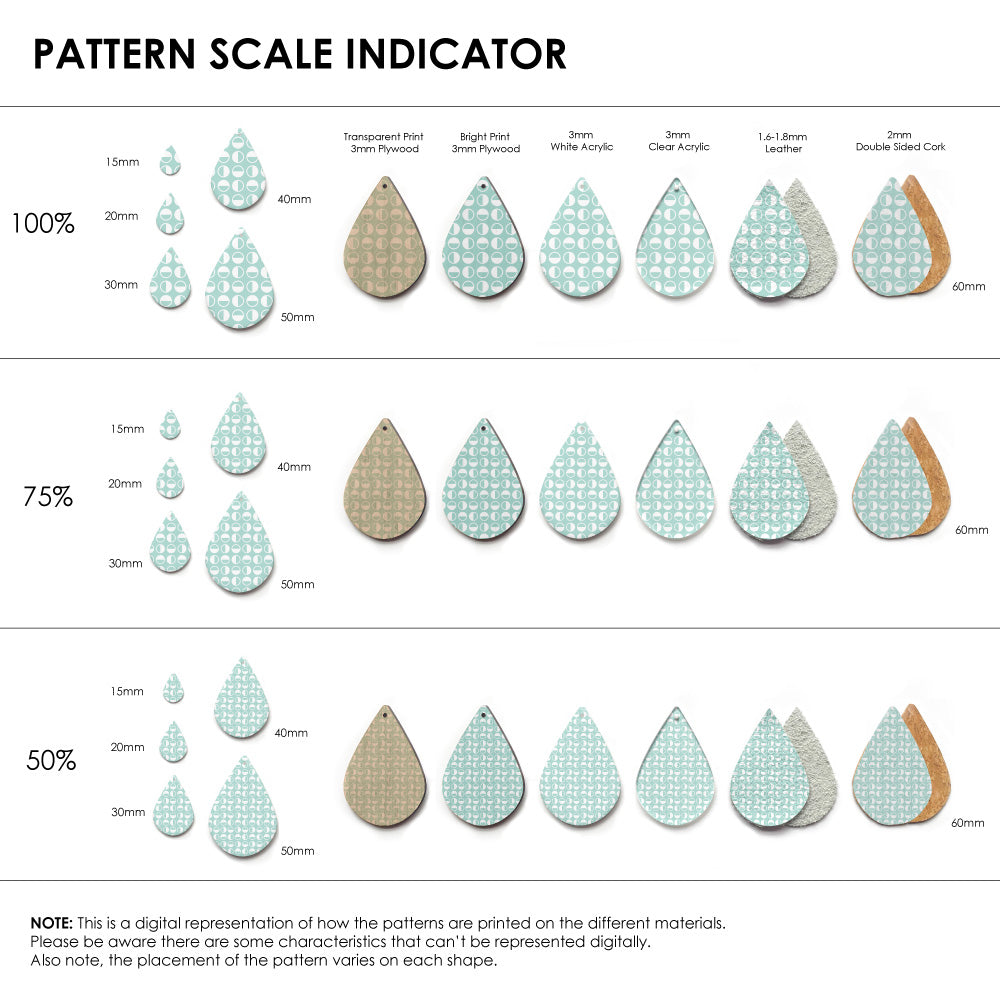 The catalogue image shown is one repeat. If the pattern is seamless, we repeat the pattern to fit to the sheet size, and then scale it so it is suitable for small pieces like earrings.