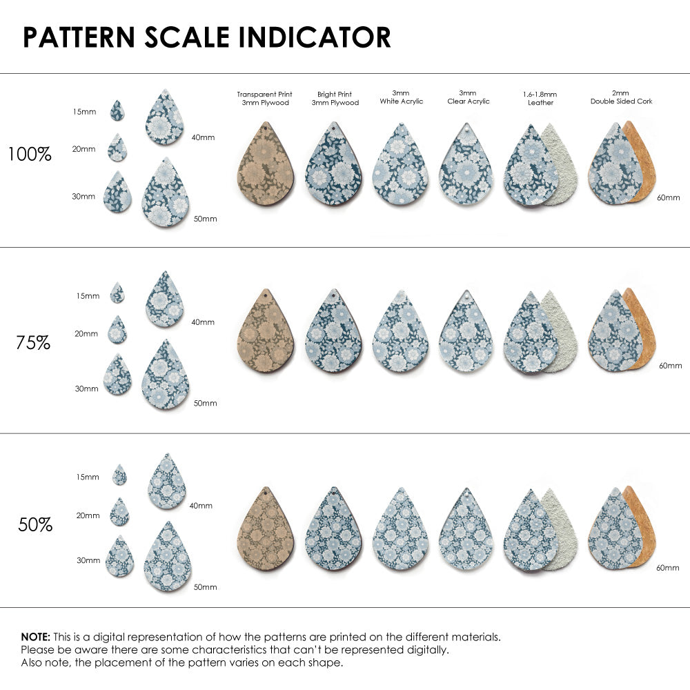 The catalogue image shown is one repeat. If the pattern is seamless, we repeat the pattern to fit to the sheet size, and then scale it so it is suitable for small pieces like earrings.