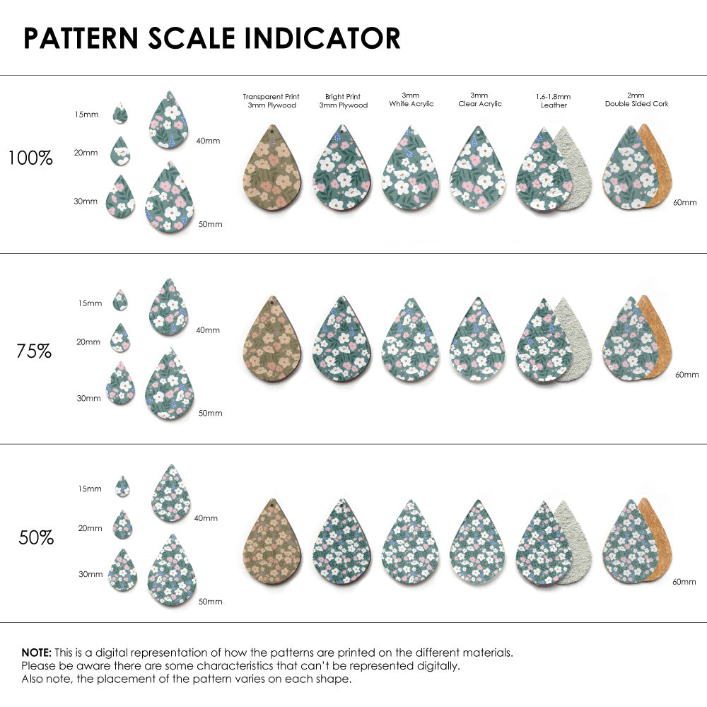 The catalogue image shown is one repeat. If the pattern is seamless, we repeat the pattern to fit to the sheet size, and then scale it so it is suitable for small pieces like earrings.